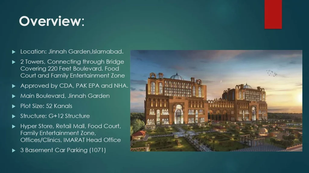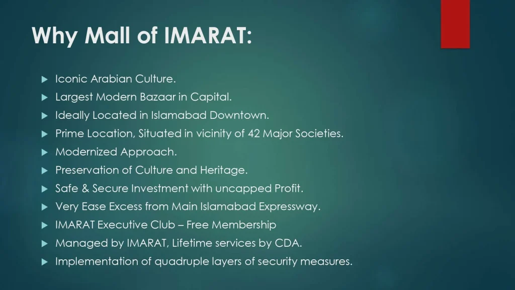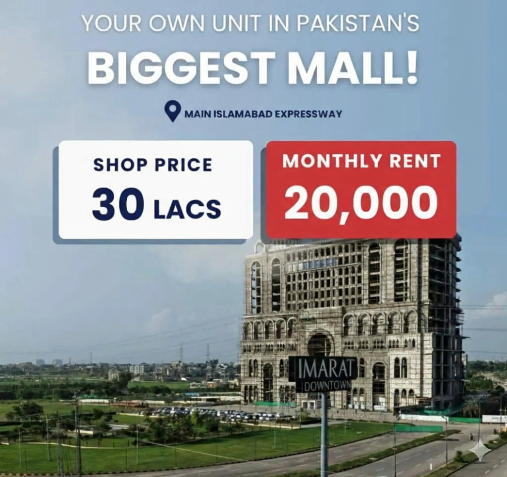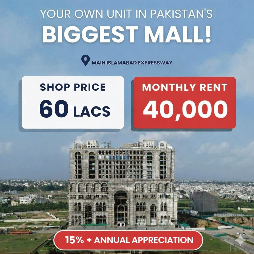 Mall of IMARAT is situated on the principal commercial and residential route known as Islamabad Expressway. The expressway seamlessly connects Islamabad city across its territorial limits from the Margallas to Rawat. Mall of IMARAT sweeps across nearly 15 kanals